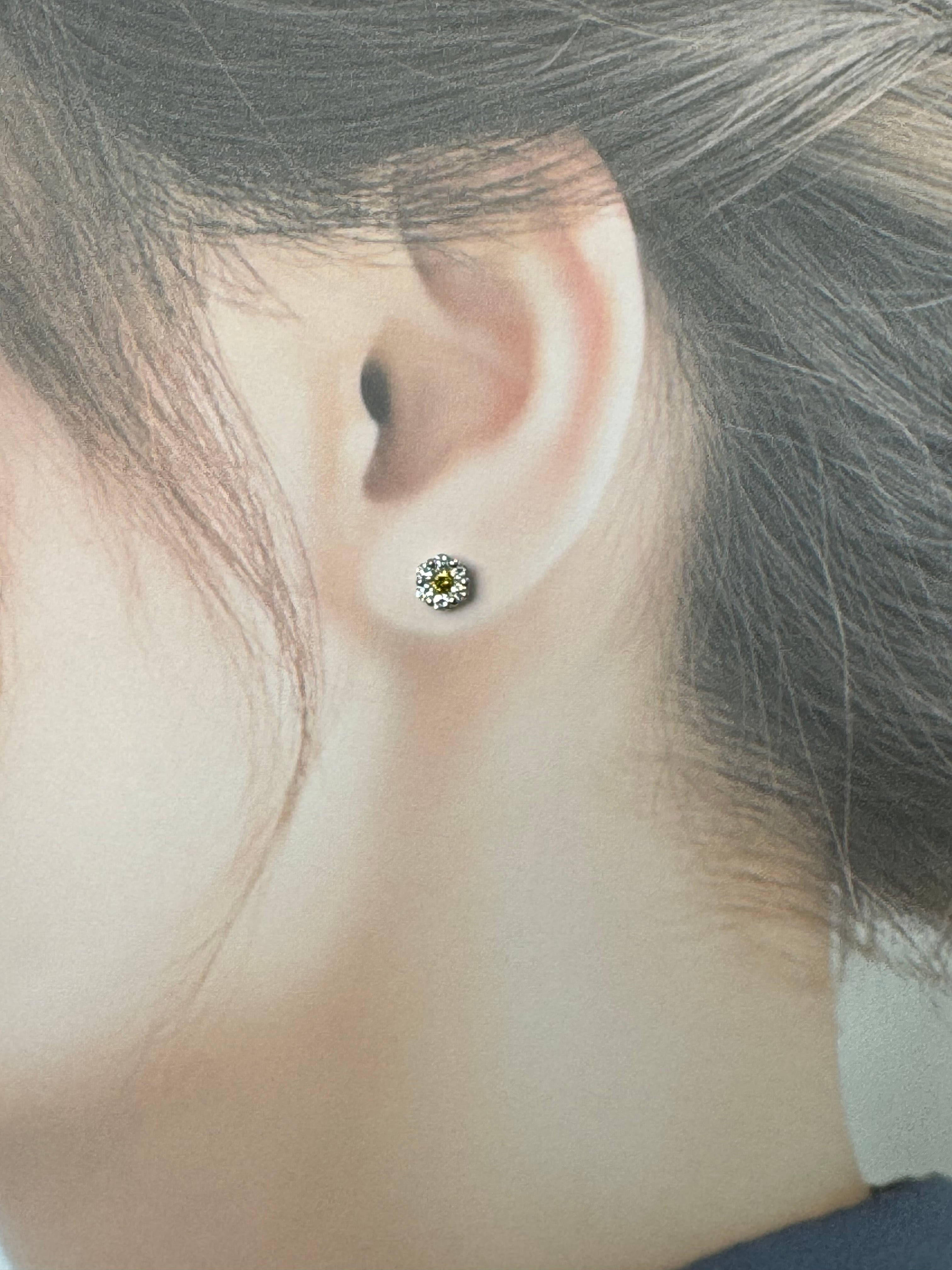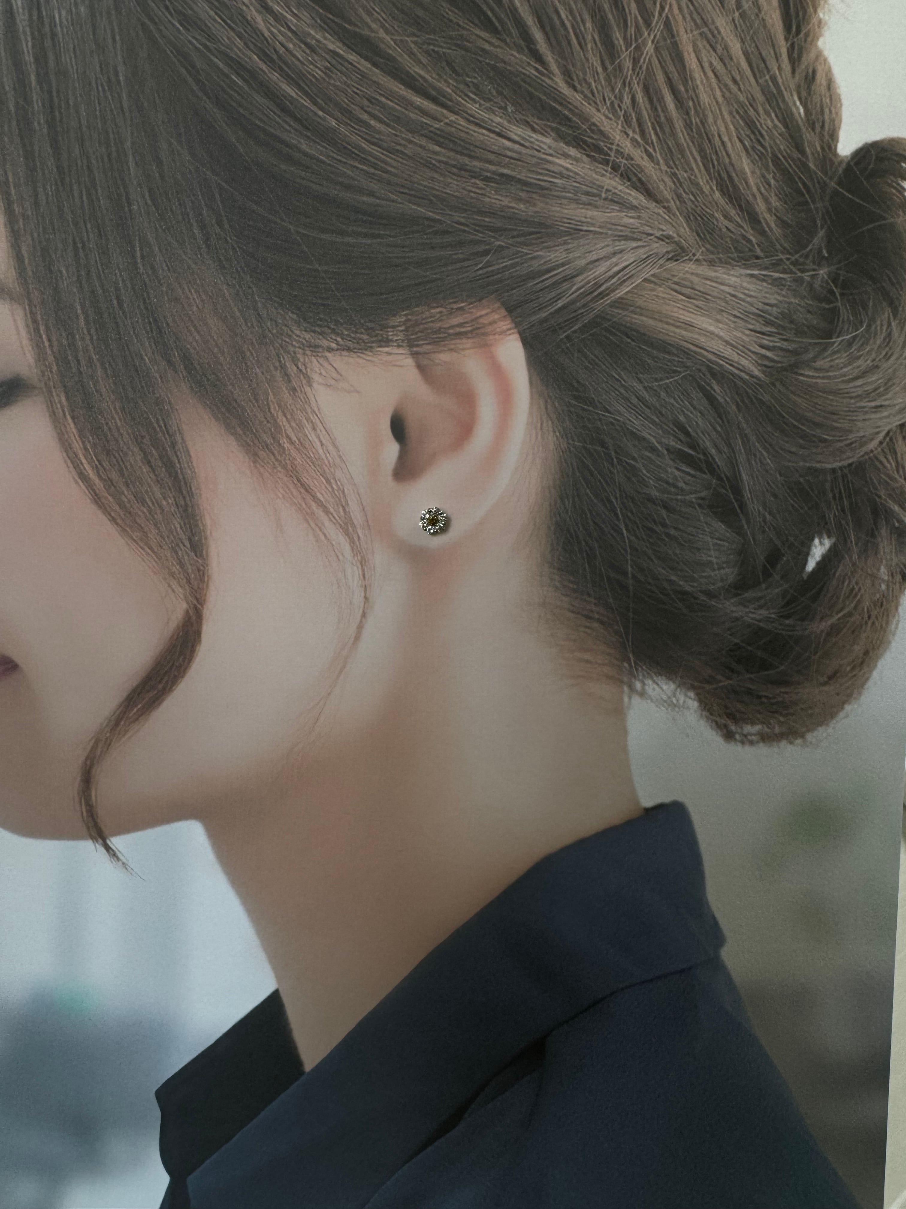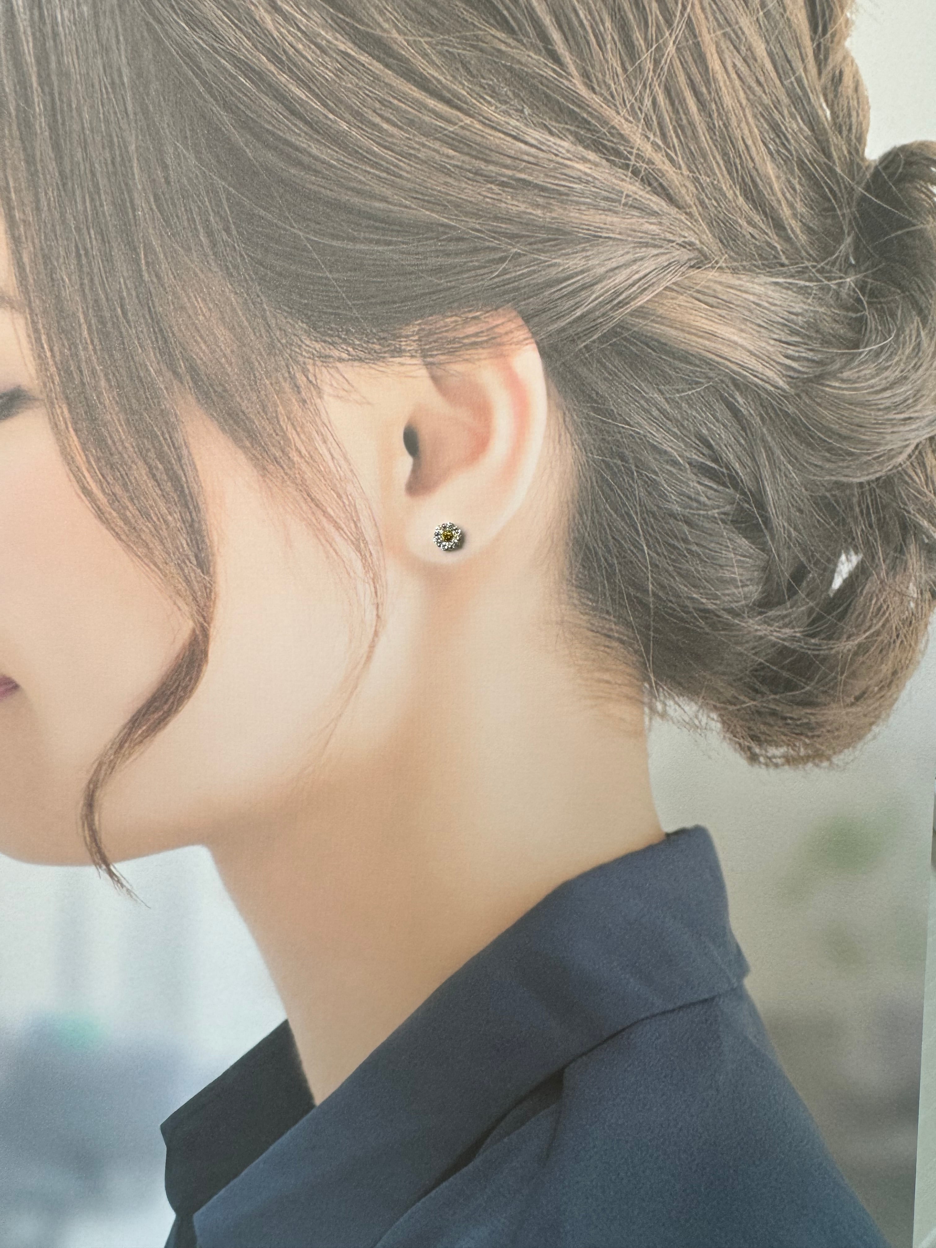 中央に輝くイエローダイヤモンドが、太陽のようにその存在感を放つピアス。周りを取り囲む透明なダイヤモンドは、その光を優しく受け止め、あたかも星々が夜空に瞬くように繊細な輝きを加えています。イエローと透明のダイヤモンドのコントラストは、自然の力と洗練された美しさを絶妙に融合させ、唯一無二のデザインに仕上がっています。