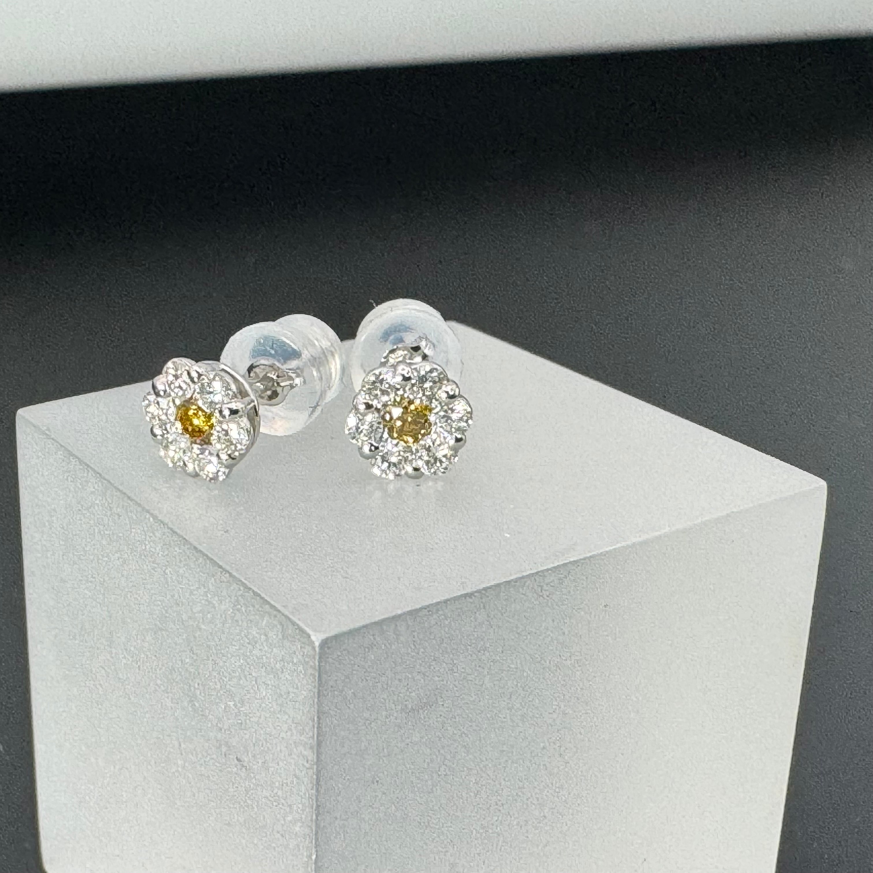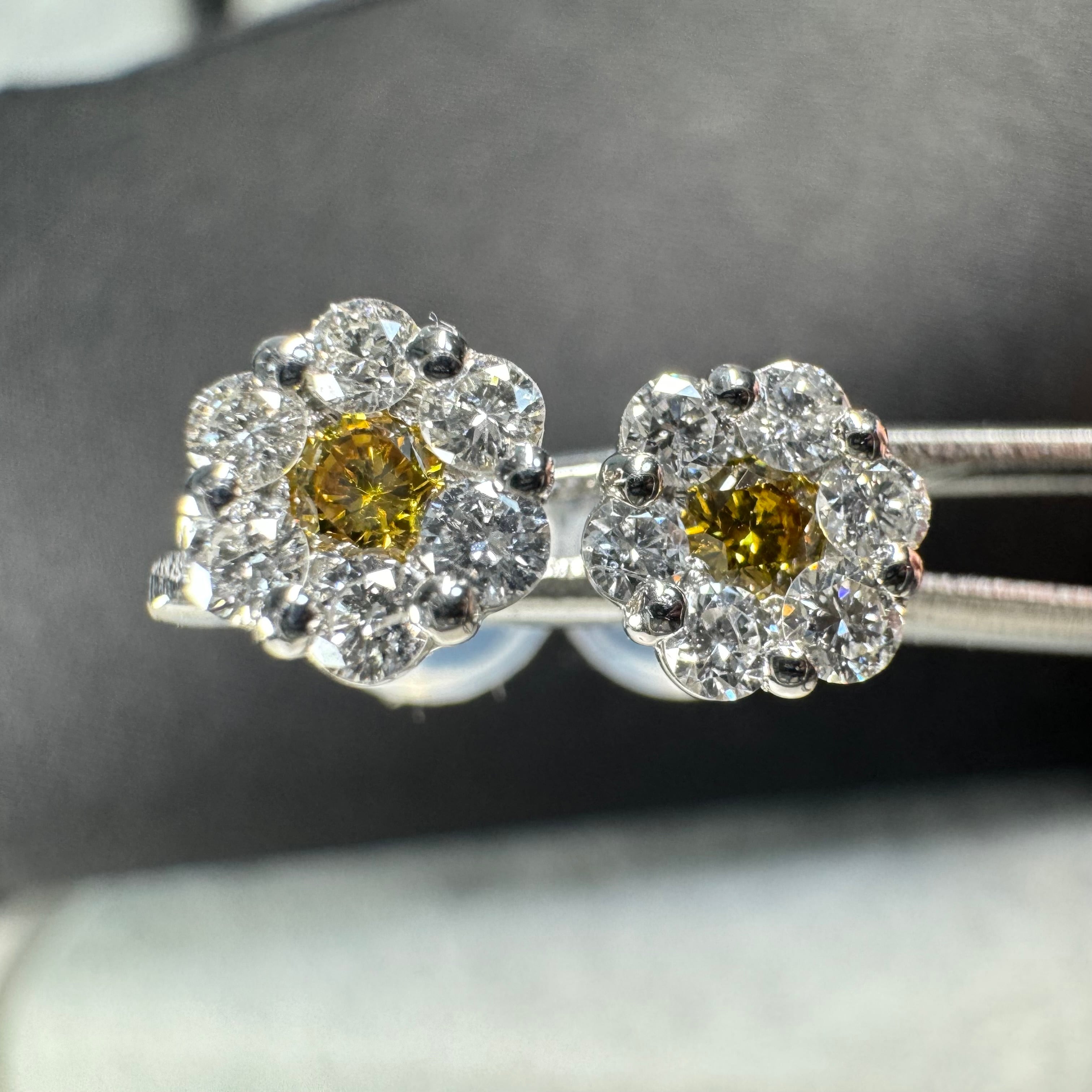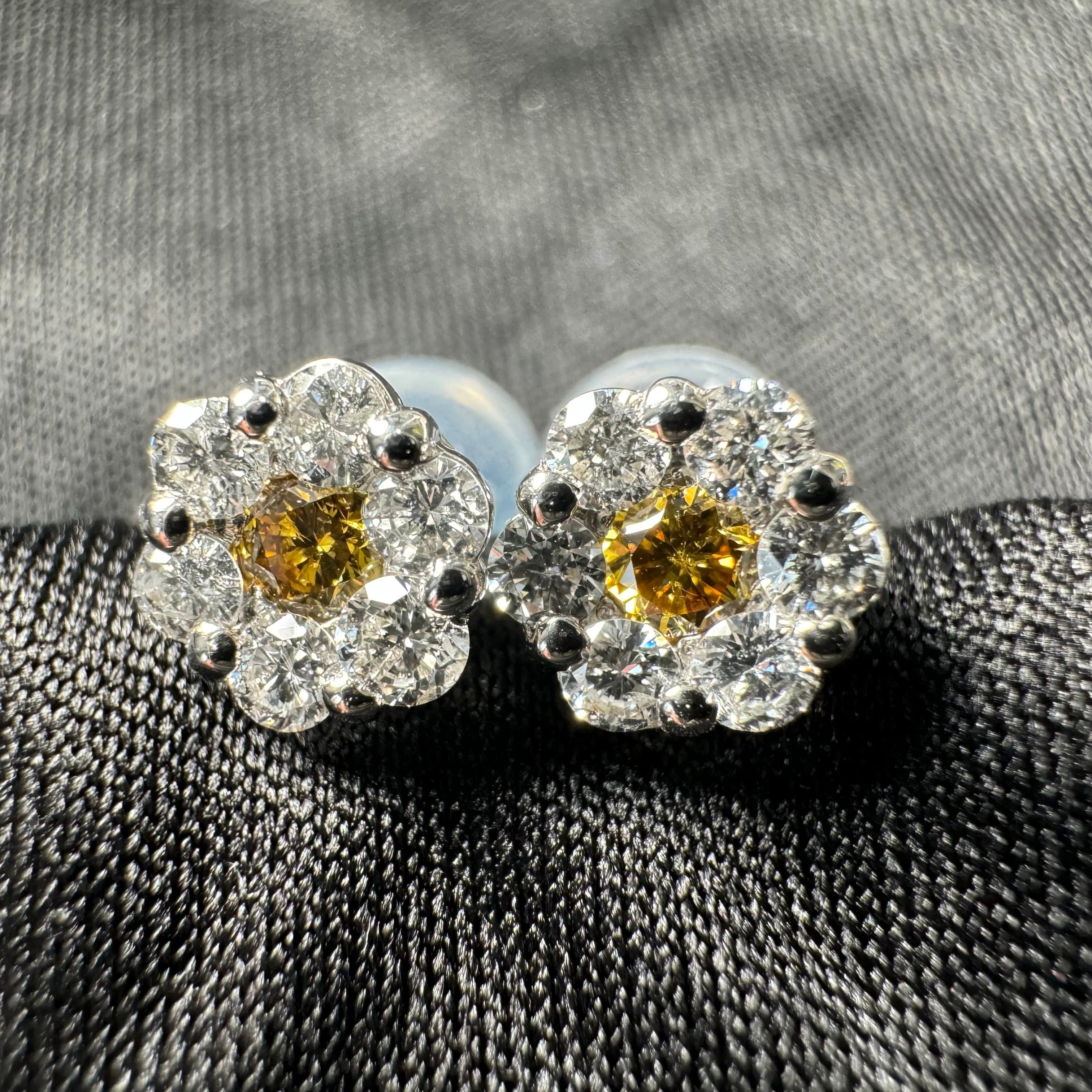 中央に輝くイエローダイヤモンドが、太陽のようにその存在感を放つピアス。周りを取り囲む透明なダイヤモンドは、その光を優しく受け止め、あたかも星々が夜空に瞬くように繊細な輝きを加えています。イエローと透明のダイヤモンドのコントラストは、自然の力と洗練された美しさを絶妙に融合させ、唯一無二のデザインに仕上がっています。
